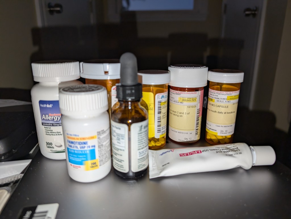 These are the things I’m currently taking – the rest are chilling in my drug basket until they have to be added to the rotation. My cat and I are actually taking two of the same drugs (famotidine and gabapentin) and I’m receiving iv fluids of my own right now. Jacky said we’re like ET and Elliott. Too funny.