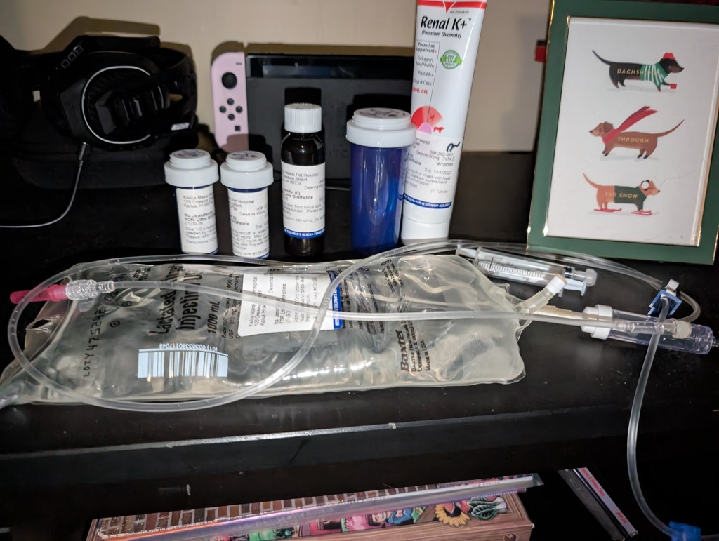 In less fun news, my 16-year-old cat has advanced kidney disease and these are her prescriptions. We’ve been giving her subcutaneous fluids every day along with other meds. She’s already in better shape than she was a week ago, but the terms “quality of life” and “end stage” have been thrown around. We’ll see how much more time we have with her.